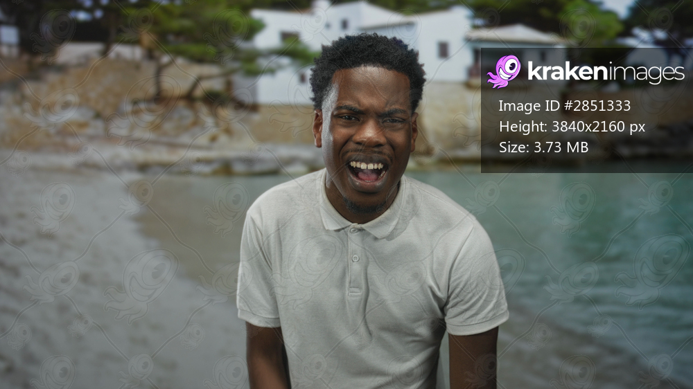 Young man frowns with furrowed brow and clenched jaw by a sunlit seaside building; inner frustration.