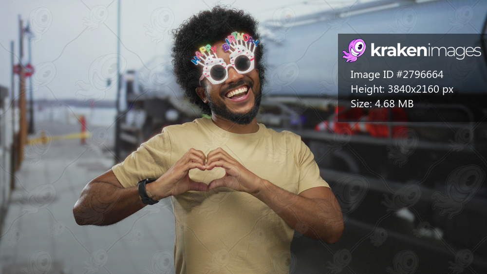 Young man with funny glasses making heart shape with hands on city street outdoors.