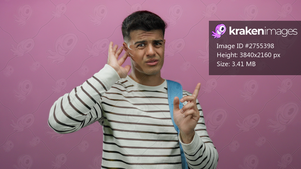 Young man gestures confusion over pink background, wearing striped sweater and backpack, expressing curiosity and listening.