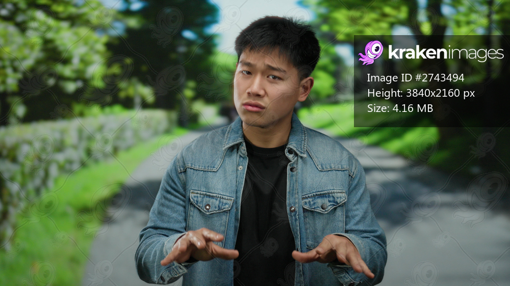 Young man gestures expressively in a lush park setting with a bright outdoor backdrop on a sunny day