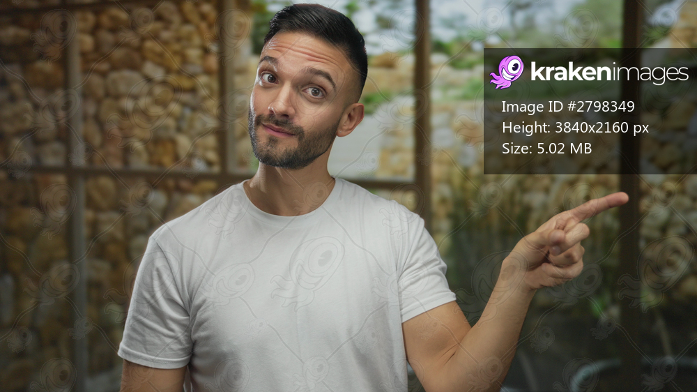 Young man gesturing in a rustic mediterranean house creates a dynamic scene with stone walls and outdoor garden view captured vividly.