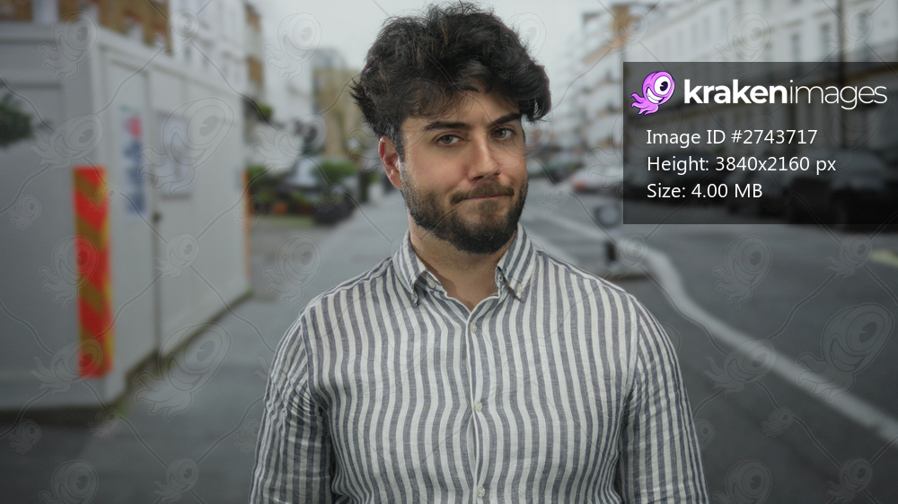 Young man gesturing no with finger on outdoor street wearing striped shirt with serious expression and unkempt hair in urban background