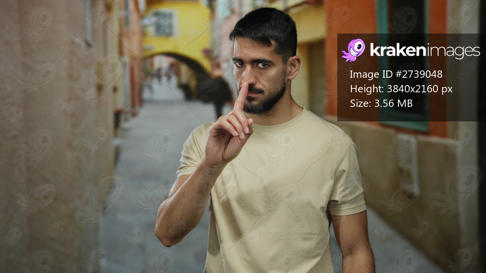 Young man gesturing no with finger on urban street with blurred colorful buildings in background.