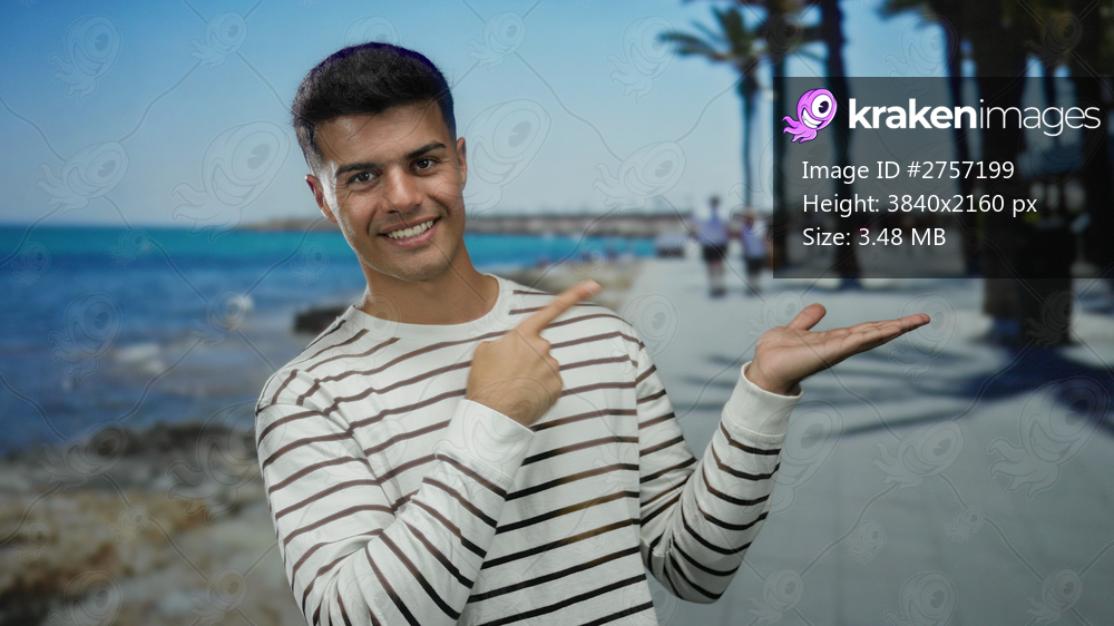 Young man gesturing okay by the seaside promenade under sunny skies capturing the essence of leisure and relaxation at the beach.