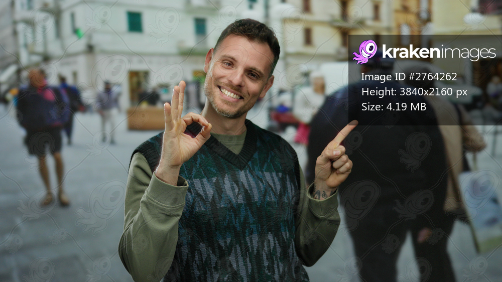 Young man gesturing okay and pointing sideways with a smile in an urban street setting surrounded by people walking by.