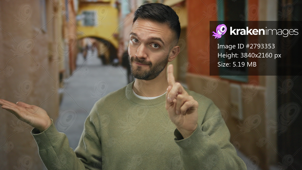 Young man gesturing on a colorful narrow street in an old urban town, expressing negation with his finger while extending his hand in a lively hispanic cityscape outdoors. - Kraken Images