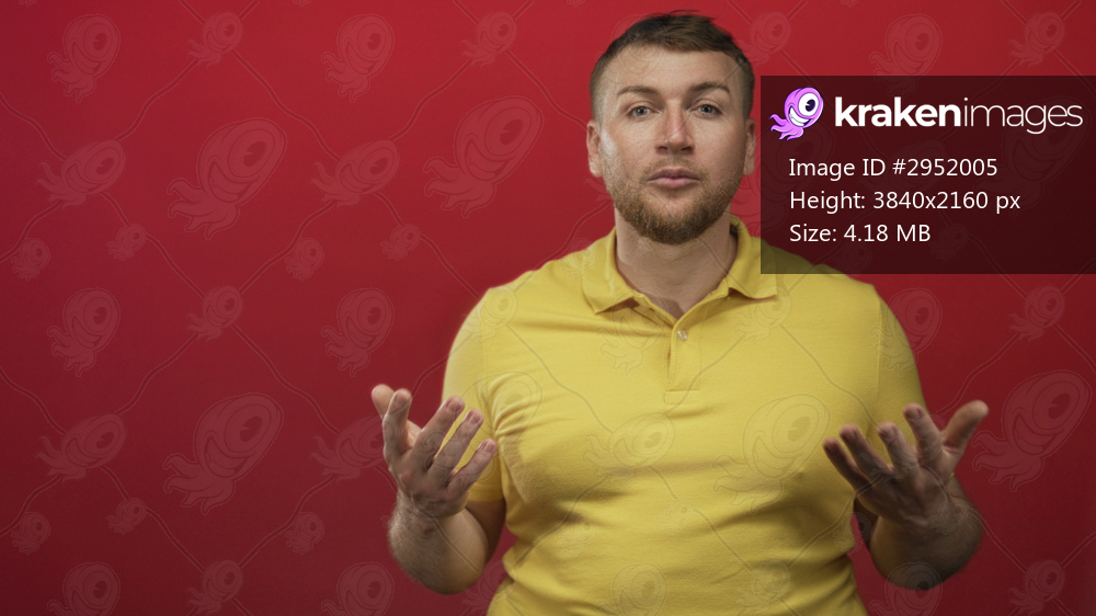 Young man gesturing with open hands in studio with red backdrop wearing yellow polo shirt and smiling; friendly communication.