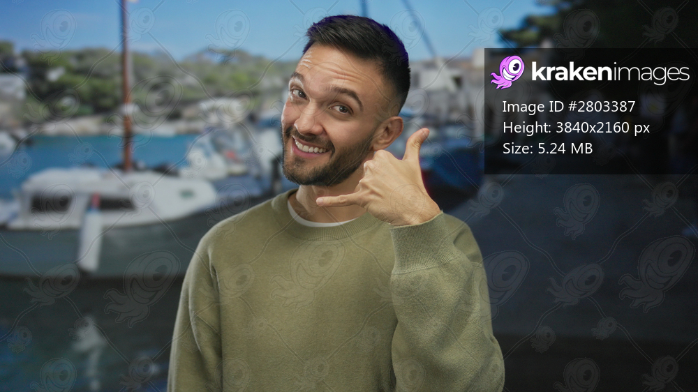 Young man gesturing phone call and pointing with smile on promenade near sea and boats