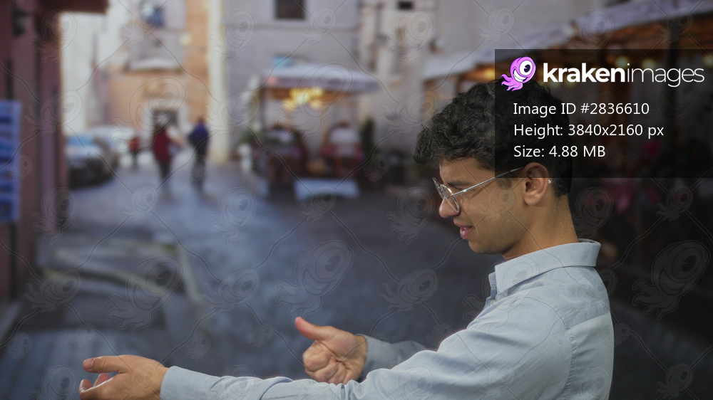 Young man gives thumbs up on bustling city street amid outdoor cafe terrace; optimism and encouragement.
