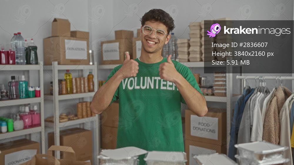 Young man giving thumbs up gesture in donation center building surrounded by food packages; generosity.
