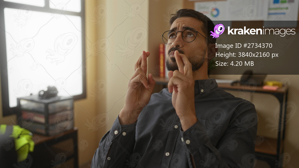 Young man with glasses and beard crosses fingers in hopes at workplace interior desk office background.