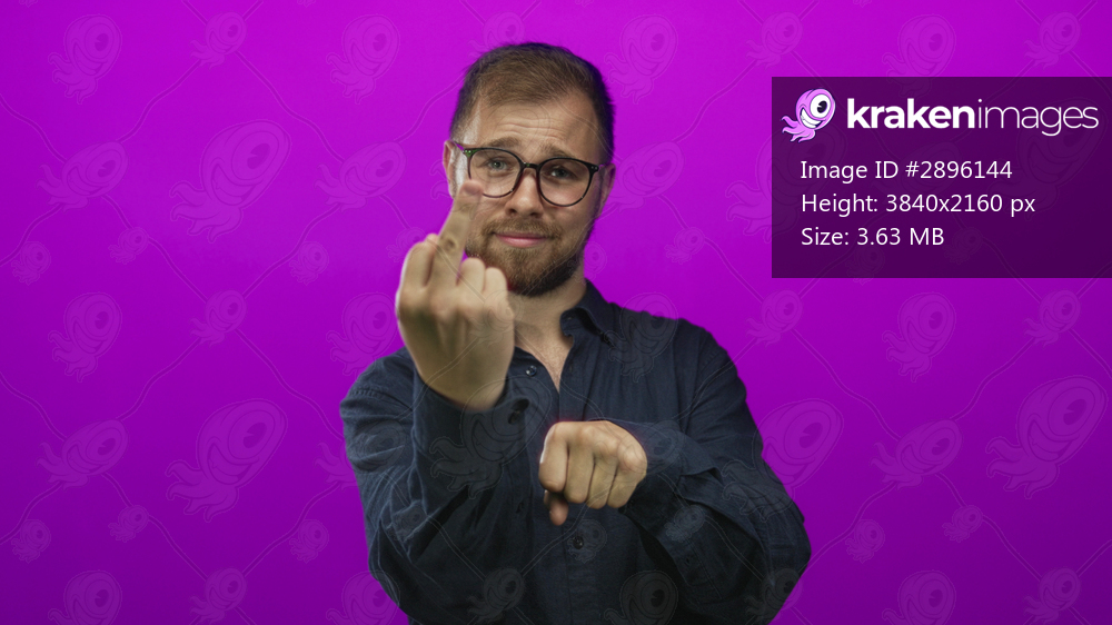 Young man with glasses and beard showing middle finger and clenched fist in magenta studio; defiance attitude.