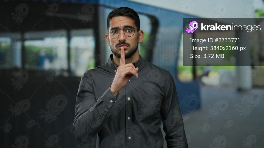 Young man with glasses gesturing silence with finger over lips in urban outdoor setting