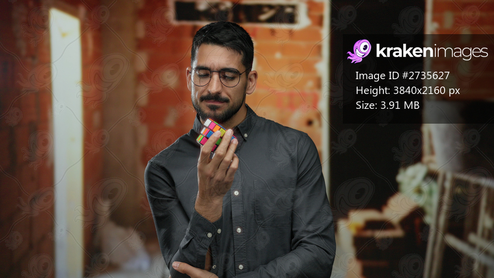 Young man with glasses holding a colorful cube thoughtfully at construction site, showcasing his attractive, intelligent demeanor amidst red brick walls indoors. - Kraken Images
