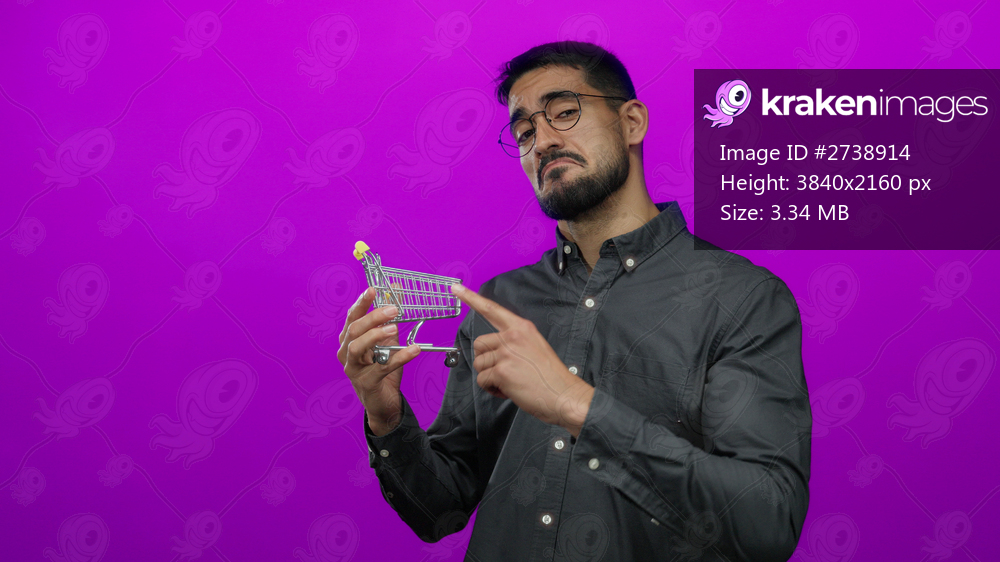 Young man with glasses holding mini shopping cart against pink background, smiling and pointing, creating a humorous retail concept with confident expression. - Kraken Images
