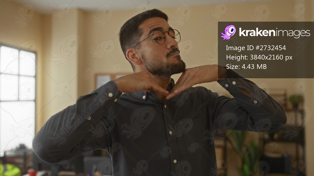 Young man with glasses in an office smiling confidently with hands near face posing playfully indoors in a relaxed workplace environment with natural light and plants. - Kraken Images