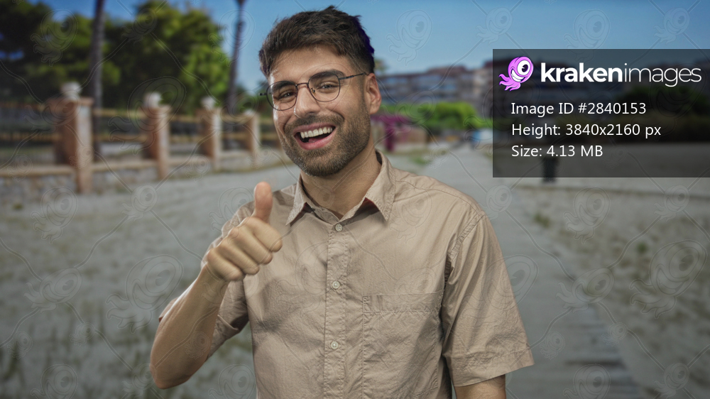 Young man with glasses in beige shirt gives thumbs up gesture on street in bright daylight; approval optimism.