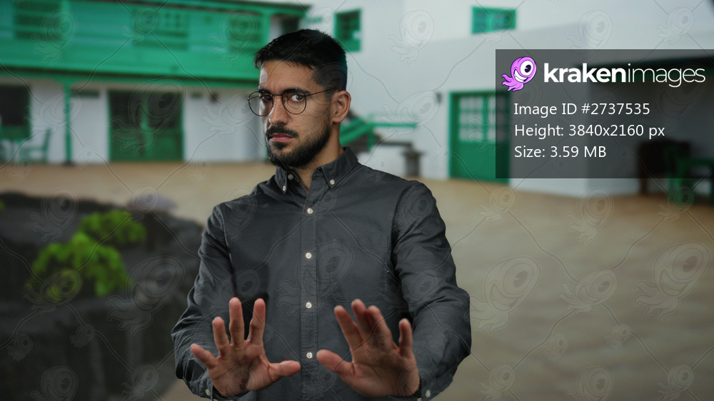 Young man with glasses inside hotel with green decor conveying attractive modern style, standing confidently while gesturing indoors on tiled floor.
