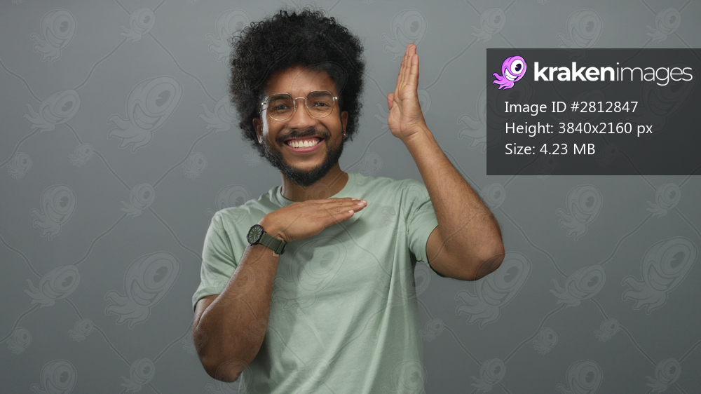 Young man with glasses joyfully gestures against a grey wall, expressing positivity and energy, wearing casual clothing and smiling brightly.