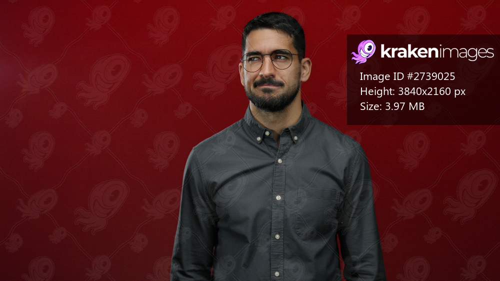 Young man with glasses poses thoughtfully against a vibrant red background, showcasing modern style and confidence.