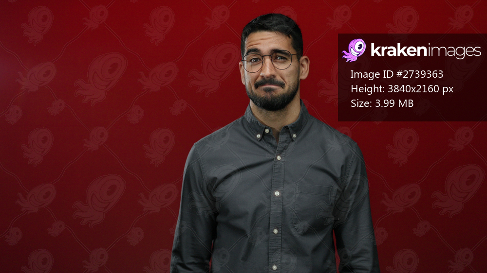 Young man with glasses poses thoughtfully against a vibrant red background, showcasing modern style and confidence.