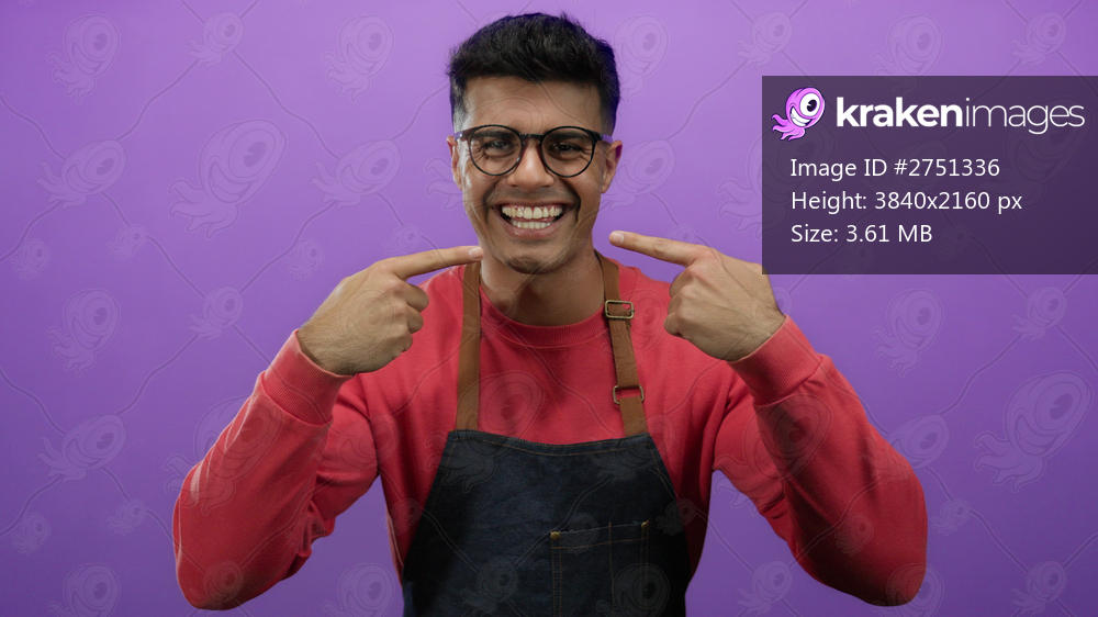 Young man with glasses smiling and pointing at his teeth against a purple background wearing a casual red sweater and denim apron.