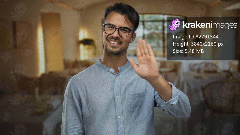 Young man with glasses smiling and waving hello in a cozy indoor restaurant setting featuring coffee and relaxed ambiance, highlighting a warm and friendly atmosphere. - Kraken Images