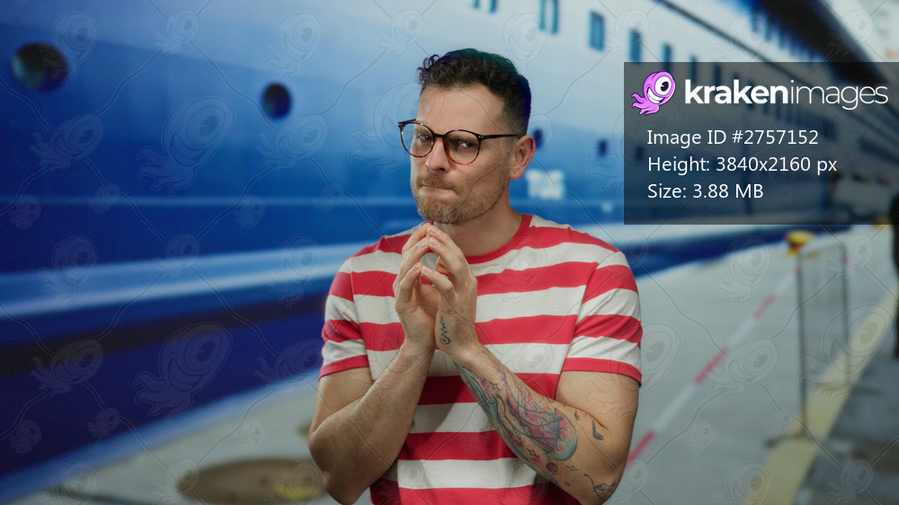 Young man with glasses and tattooed arms smiling joyfully at a port with a large cruise ship in the background in a red and white striped shirt, creating a vibrant seaside atmosphere. - Kraken Images