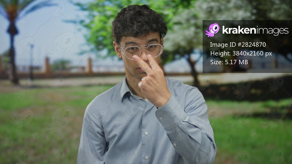 Young man with glasses touches neck in green park among blurred trees and a path; personal reflection.