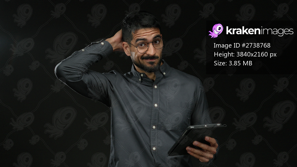 Young man with glasses using tablet over black background looks thoughtful and engaged