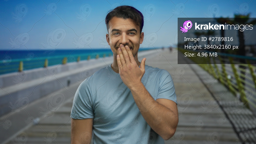Young man with hand covering mouth on seaside promenade with ocean view exuding surprise and relaxation in an outdoor setting under a clear blue sky.