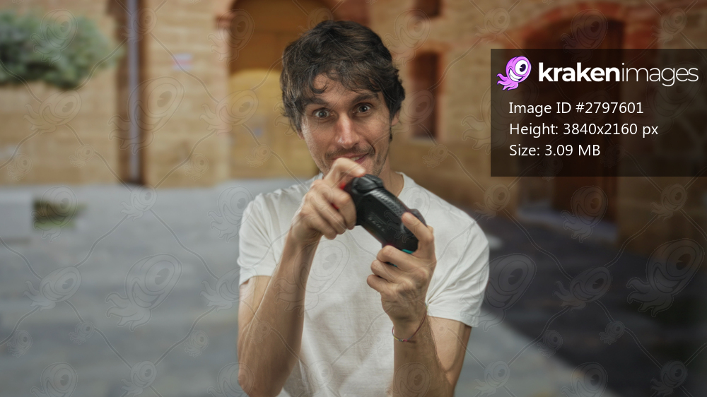 Young man hand grips black gamepad pressing button in historic university building courtyard; determination.