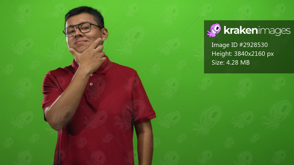 Young man with hand on chin posing in studio green backdrop wearing red polo and glasses; thoughtful reflection.