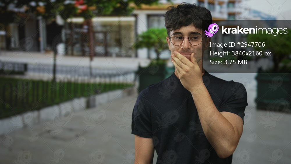 Young man hand on chin thinking gesture on street near planter and railing, wearing glasses and black t shirt; thoughtful reflection.