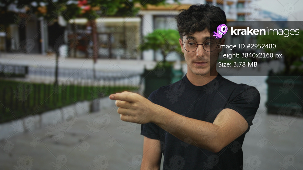 Young man hand on chin thinking gesture on street near planter and railing, wearing glasses and black t shirt; thoughtful reflection.