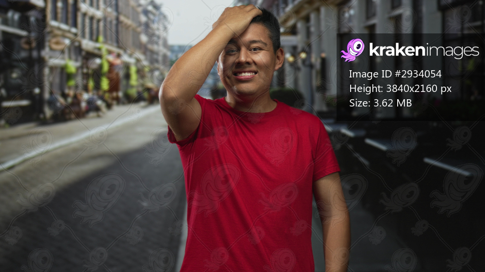 Young man with hand on head on a busy city street wearing red t shirt; happiness casual moment smile.