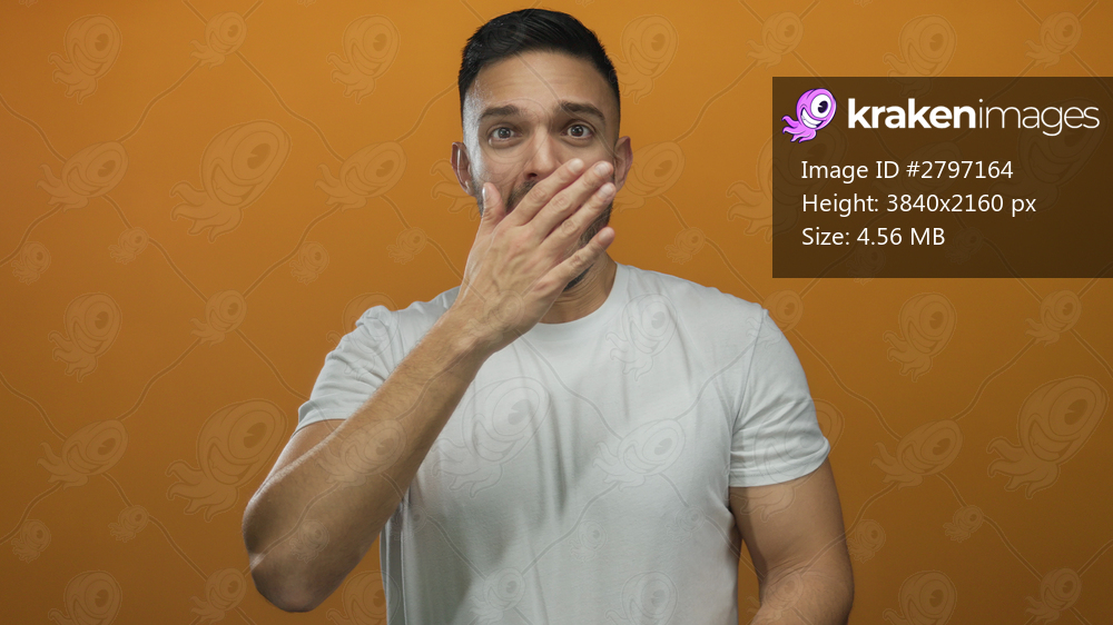 Young man with hand over mouth standing against a bright orange background expressing surprise or laughter in a casual setting captured in vivid color and detail. - Kraken Images