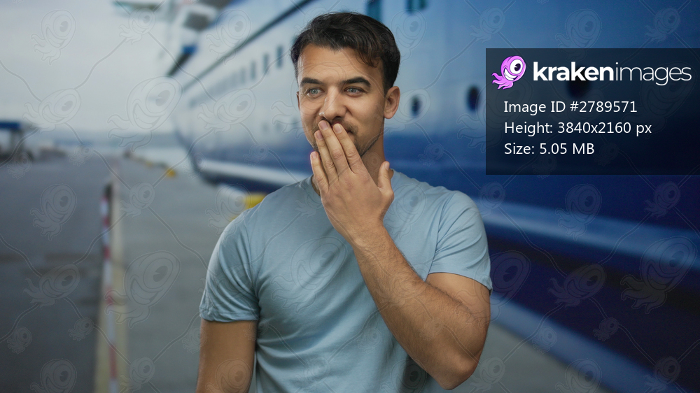 Young man with hand over mouth standing at port beside large cruise ship, wearing casual blue shirt, evoking surprise outdoors at a seaside location.