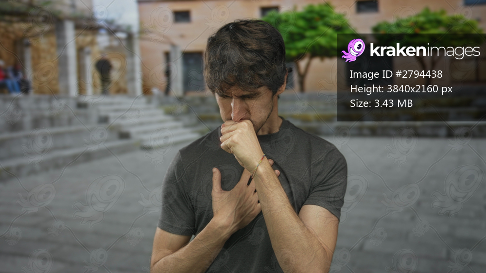 Young man with hand pressed to chest covering mouth in cobblestone street beside stone steps; heartattack pain.