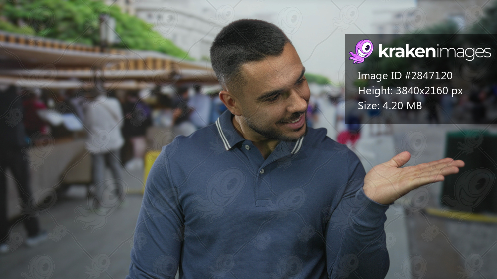 Young man hand showing three fingers at busy street market stall amid city scene; playful confidence.