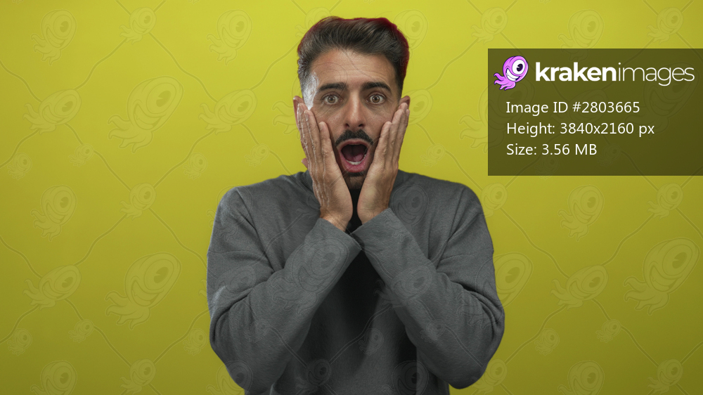 Young man with hands on cheeks and mouth open in yellow studio, staring with wide eyes at camera; surprise.