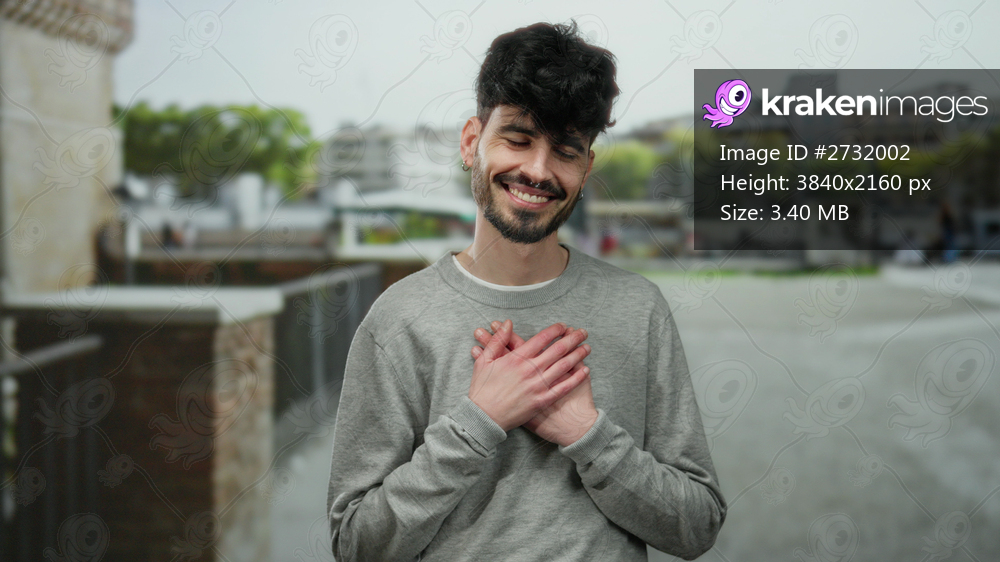 Young man with hands on chest smiling warmly outdoors in urban street setting.