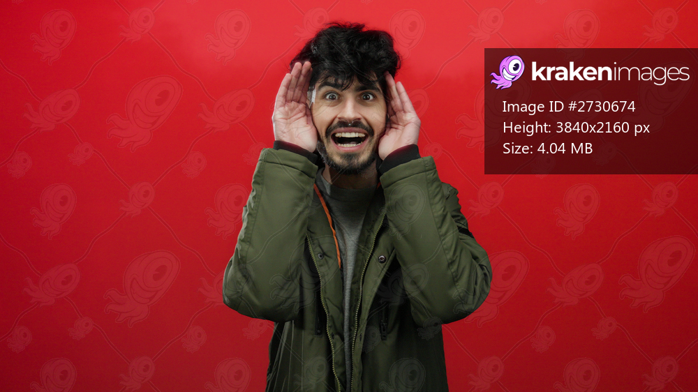 Young man with hands on face against red background wearing green jacket expresses various emotions vividly