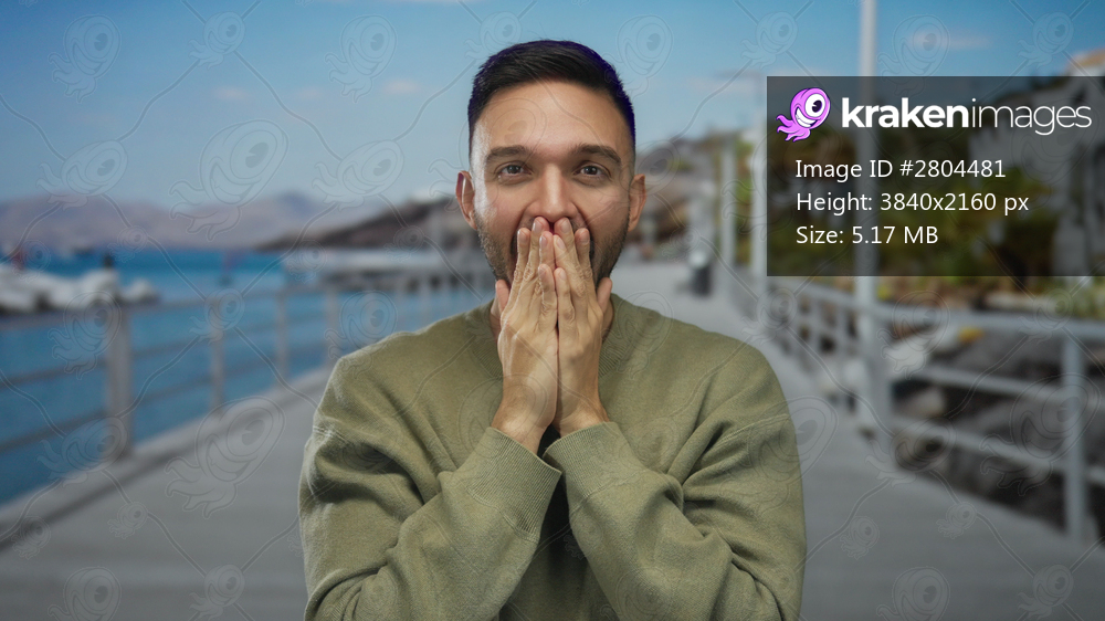 Young man with hands on face expressing surprise on a seaside promenade with beach and sea in background on a sunny day outdoors.