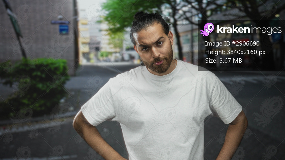 Young man with hands on hips and skeptical frown in city street wearing white t shirt and bun, leaning forward slightly; skepticism.