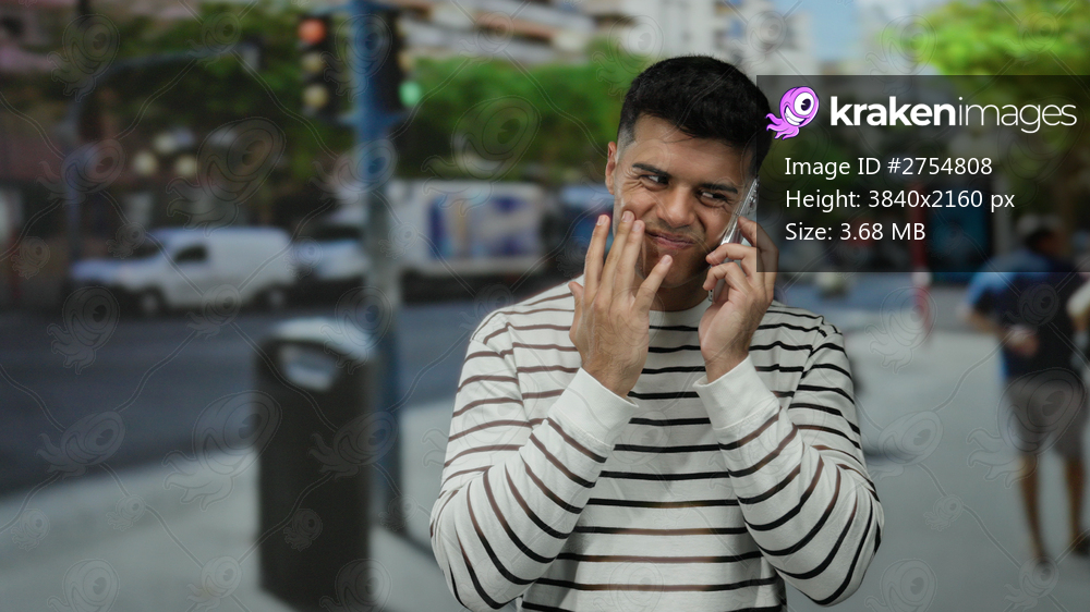 Young man having phone conversation on a bustling city street, displaying lively expressions, with urban vehicles and pedestrians in the background.