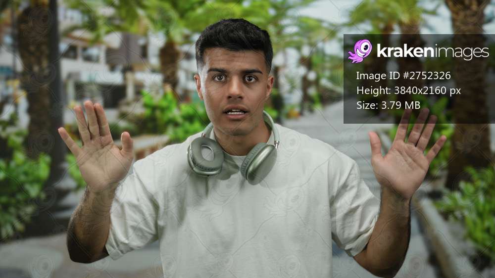 Young man with headphones gestures expressively on a vibrant city street lined with palm trees showcasing urban energy and a lively atmosphere.