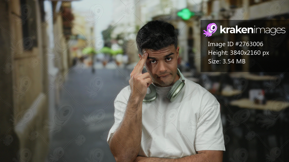 Young man with headphones gestures on a city street terrace with blurred cafe in background, wearing white shirt, illustrating urban lifestyle and diverse emotions. - Kraken Images