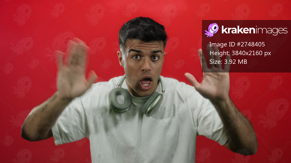 Young man with headphones gesturing playfully against a solid red background, capturing an energetic and lively mood with a modern, stylish vibe.