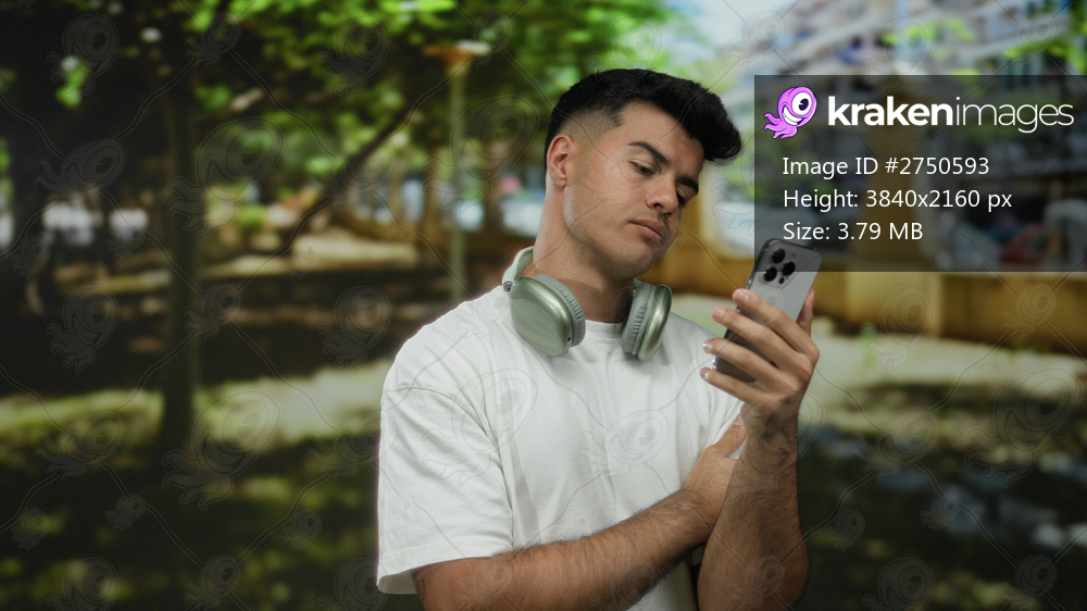 Young man with headphones looks at smartphone in a park, surrounded by greenery, displaying a thoughtful expression in an outdoor urban setting.